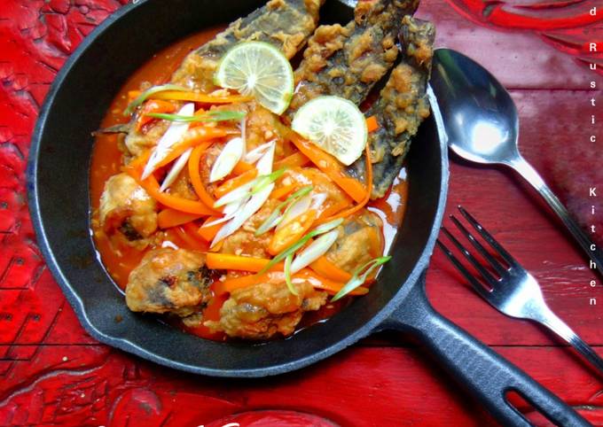 - Masukkan ikan lele goreng ke dalam wajan, aduk rata dengan saus asam manis.